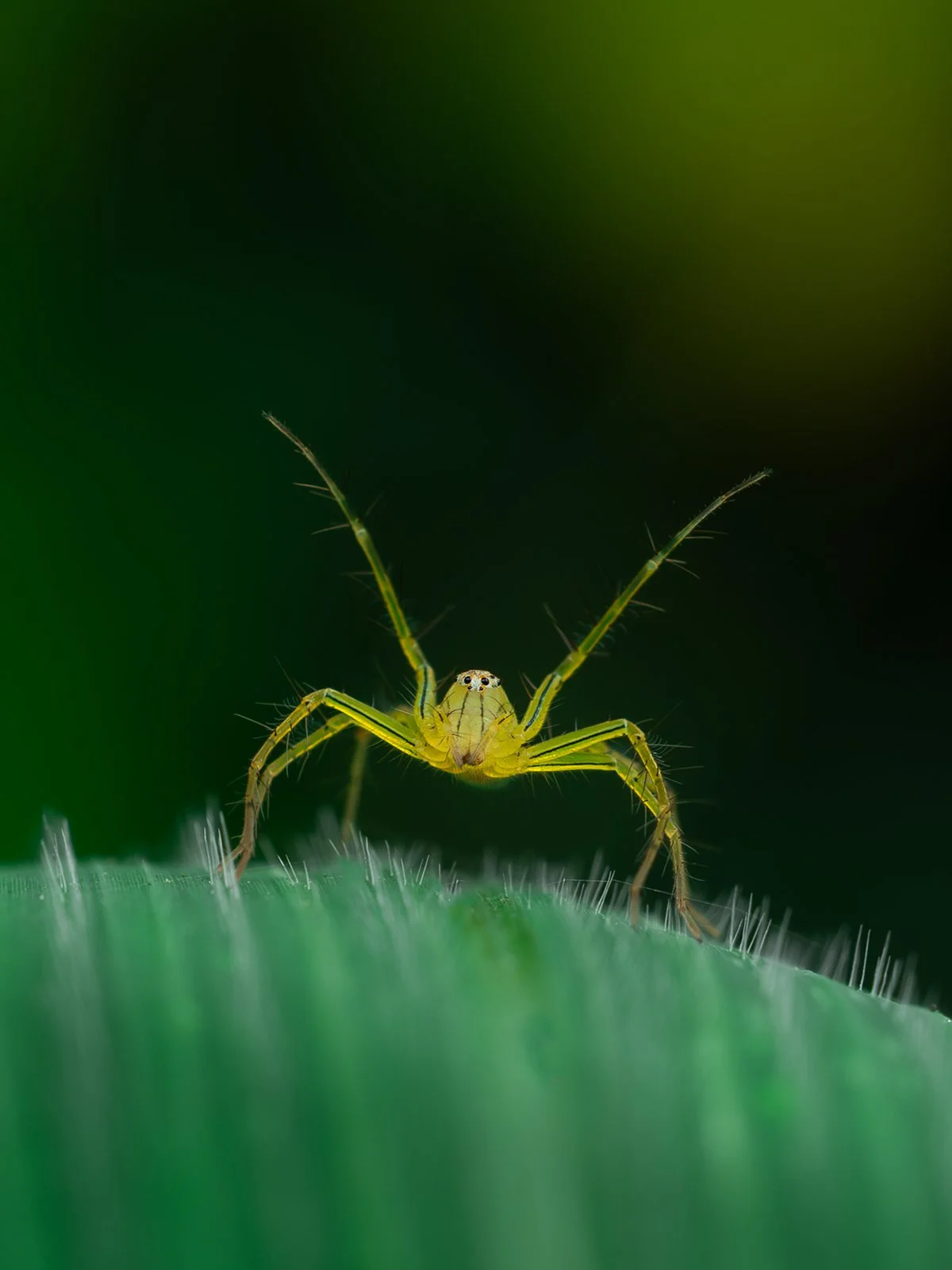 Close-up of a small, yellow spider on a green leaf, with a blurred green background. View fullsize