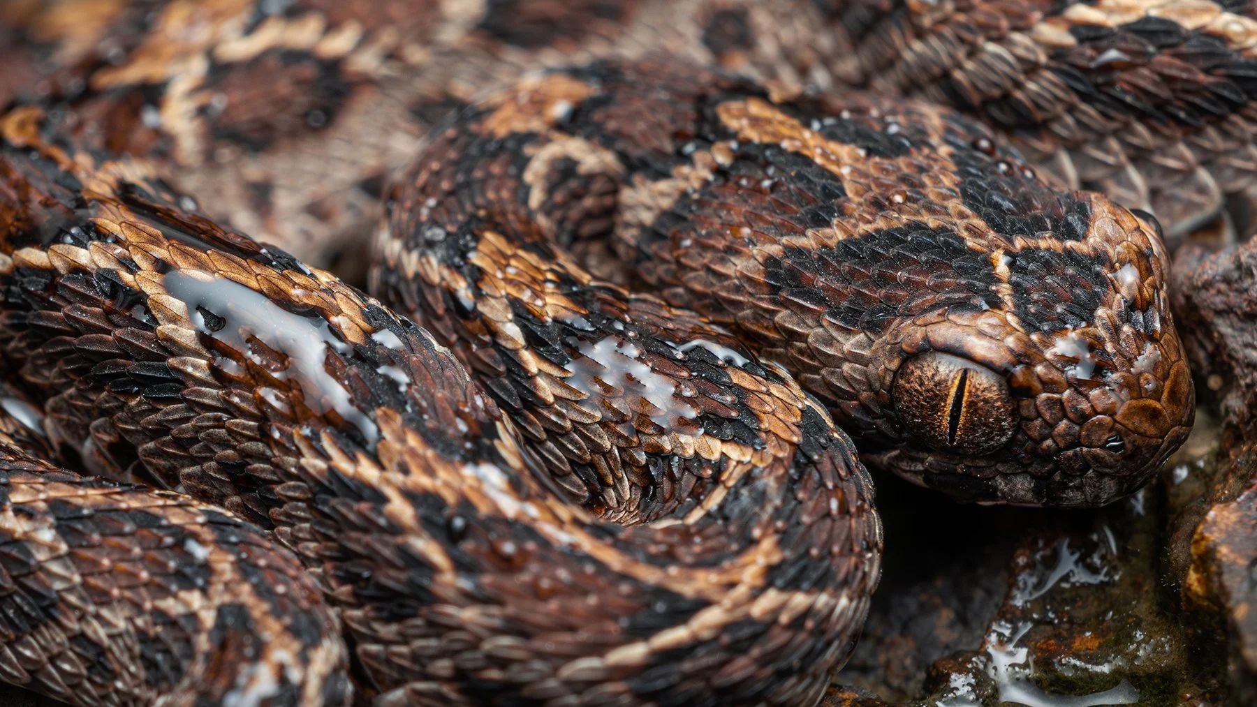 Close-up of a snake with dark brown and black scales coiled on rocks with water droplets. View fullsize
